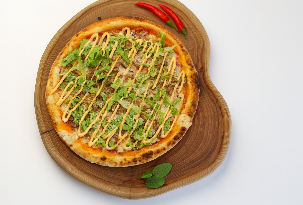 Соус Наполи, сыр моцарелла,фарш говяжий,микс салата,огурец маринованный,лук красный,соус гриль
