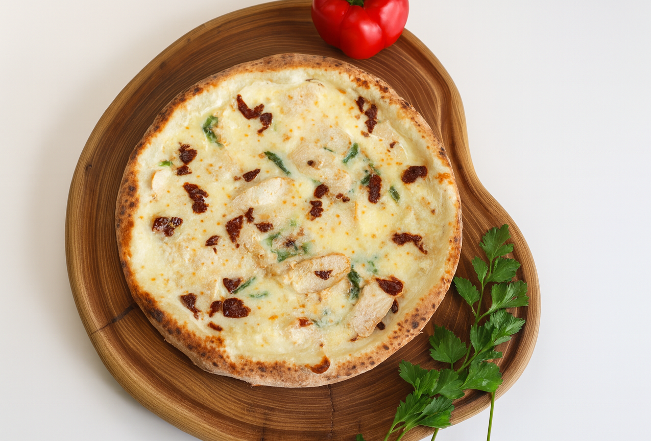 Соус альфредо, сыр моцарелла,куриное филе,шпинат свежий,вяленые черри,соус барбекю,пармезан